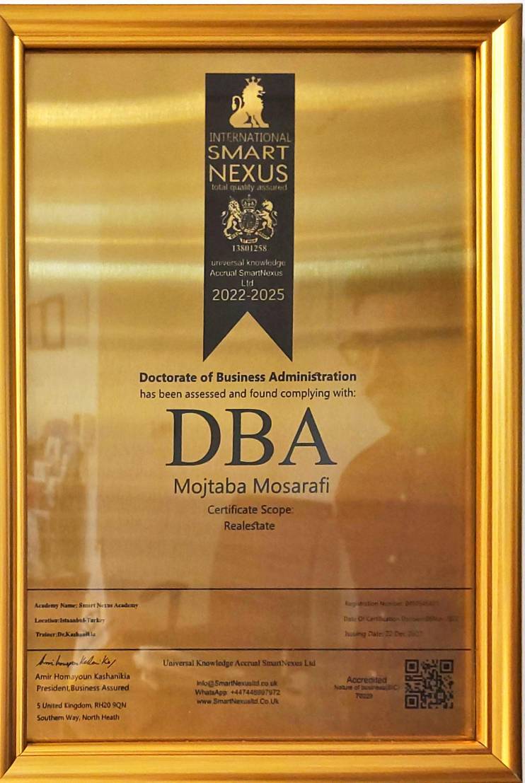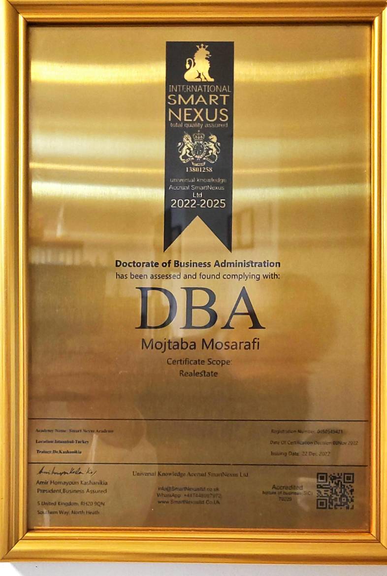 این دوره بین المللی  شامل سه ترم به شرح زیر می باشد:ترم 1:شامل ۶ جلسه ۸ ساعته می باشد هر ماه یک جلسه مدرک ارائه شده MBA از DNWCANADA هزینه سی میلیون تومان سرفصل ها:آموزش صفر تا صد مشاوری و دلالی املاکآموزش ۷ رکن سیستم مدیریت آژانس املاک به همراه مدیریت ریسکآموزش CRM و باشگاه مشتریان و آشنائی با ماهیت سازمانآموزش فرآیند محوری و کنترل و پایش فرآیندآموزش مدل های رهبری سازمان ،چارت سازمانی، منشور اخلاقی، خط مشی سازمان، پست ها و نقش هاو برنامه ریزیآموزش پشتیبانی ،زیرساخت‌ها بهمراه کنترل عملیات،ارزیابی عملکرد  و افزایش بهره وری سازمانترم دوم :